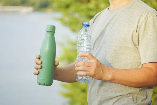 Eco lifestyle concept: man holding reusable metal water bottle and plastic bottle outdoors. Contrast between sustainable choice and disposable waste, symbolizing zero waste, recycling, mindful habits
