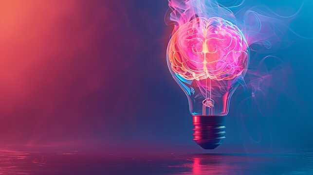 3D brain with light bulb contour showcasing vibrant neural activity set on a minimalist pastel indigo background embodying creative inspiration