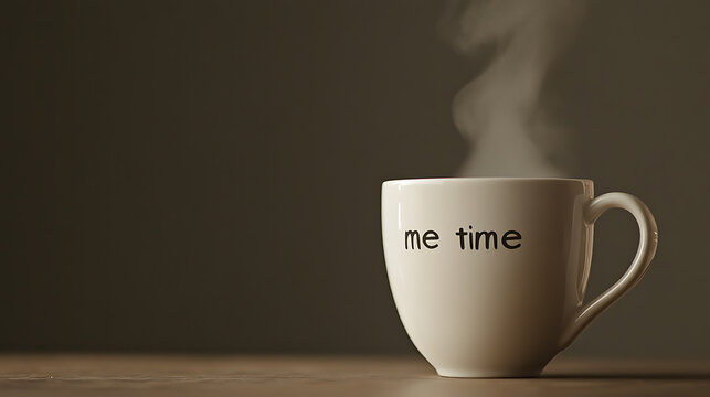 Warm beverage in a mug that reads "me time", steam rising in a dimly lit room. A mindful moment captured with depth and clarity, promoting relaxation and peace.