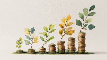 A creative illustration showing plants growing alongside stacks of coins, symbolizing financial growth and sustainability.