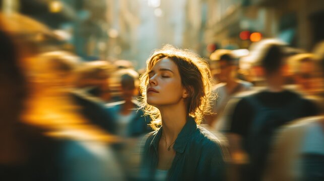 Young woman standing still with closed eyes in the middle of a busy city street, finding calm and mindfulness while blurred crowds move around her