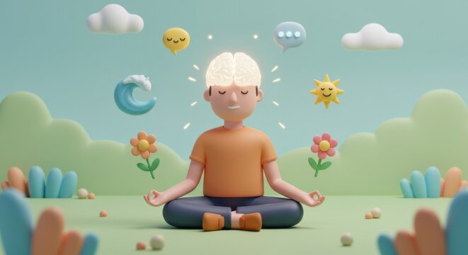 Whimsical cartoon child meditating in a serene dreamlike landscape for mindfulness and relaxation