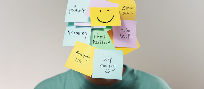 Mental Mind, Enjoying Life Concept. many Sticky Note on Face with Handwriting text. Happy Person