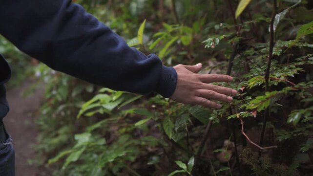 Close-up video of a man’s hand brushing against lush green plants as he walks through a calm forest, conveying serenity, mindfulness and connection with nature.