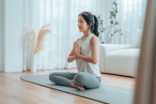 Young Asian woman meditating in lotus position at home, sitting on the floor in fitness clothing. Breathing workout to achieve relaxation, peace and mindfulness