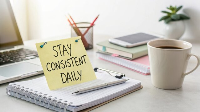 Stay Consistent Daily Motivational Sticky Note on Desk with Laptop, Coffee Cup, Notebook, and Plant in Modern Workspace