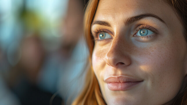 A woman with closed eyes enjoys the fresh air, hair blowing in the breeze under a clear blue sky.