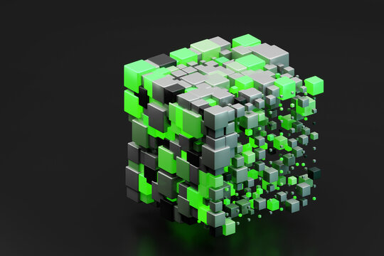 3d render, abstract geometric background, colorful constructor, logic game, cubic mosaic structure, isometric wallpaper, red green cubes