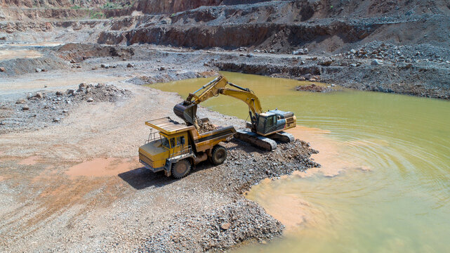 Mining industry. Crawler excavator loads mined ore into a mining dump truck.