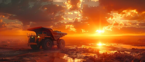 Sunset scene of a haul truck transporting mined material in an open-pit mine. Concept Mining Industry, Haul Truck, Open-Pit Mine, Sunset Scene, Mined Material Transport