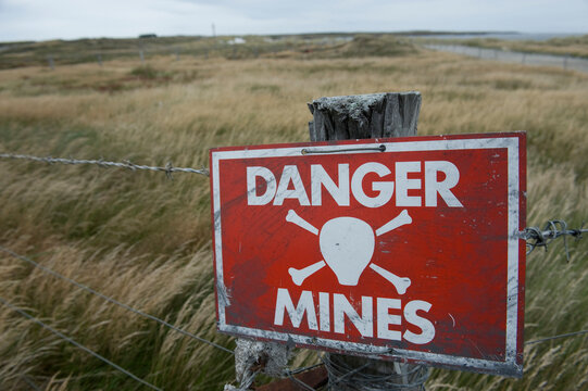 Sign warning of land mine danger in Stanley, Falkland Islands; Stanley, Falkland Islands, British Overseas Territory