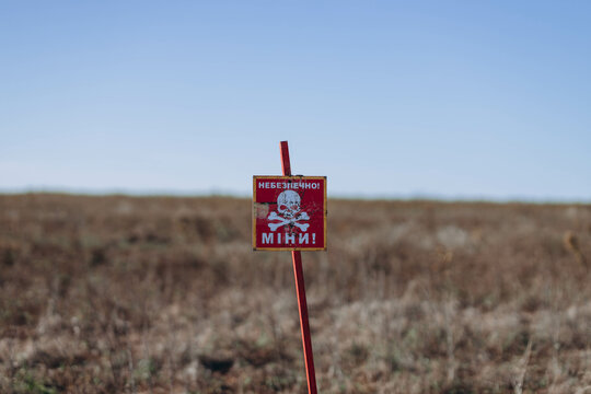 Mykolaiv region, Ukraine - 10 October 2023. Translation: "Dangerous, mines!" danger minefield in Former Russian army position. White skull-and-crossbones symbol on a red sign warning of the danger