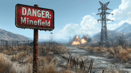 Warning sign indicating a minefield in a desolate desert setting with distant explosions visible