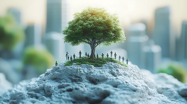 Green tree on rocky island surrounded by city buildings and tiny people nature