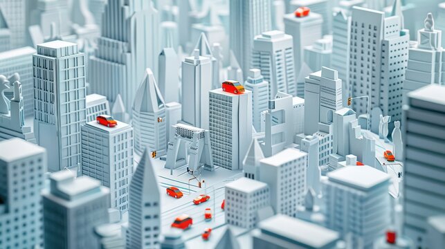 A miniature cityscape filled with white skyscrapers and red cars, showcasing urban life in a stylized, artistic way.