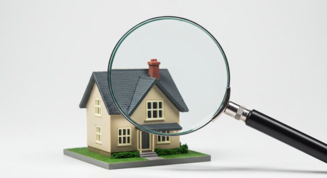 A miniature house model is being examined closely with a magnifying glass against a white background