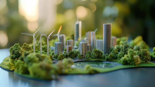 miniature green city model features modern skyscrapers, lush trees, and wind turbines, symbolizing sustainable urban living. scene is vibrant and eco friendly