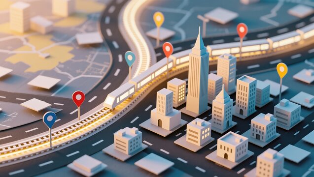 Detailed miniature city model featuring illuminated train tracks, tall buildings, and colorful location markers, viewed within soft evening light featuring the modern urban design
