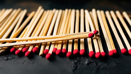 matches, red tips, wooden sticks, aligned, organized, dark background, macro photography, symmetry, repetition, fire hazard, flammable objects, striking surface, close-up, panoramic composition, minim