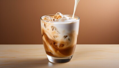 A glass of iced coffee with a swirl of milk mixing in, creating a marbled effect, on a minim