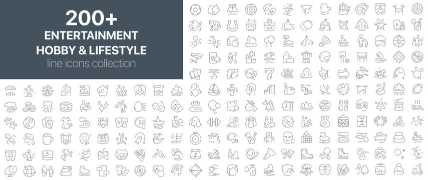 Entertainment and lifestyle icons collection with hobbies, relaxation, games, sports, leisure, and free time activities presented in minimalist line art style
