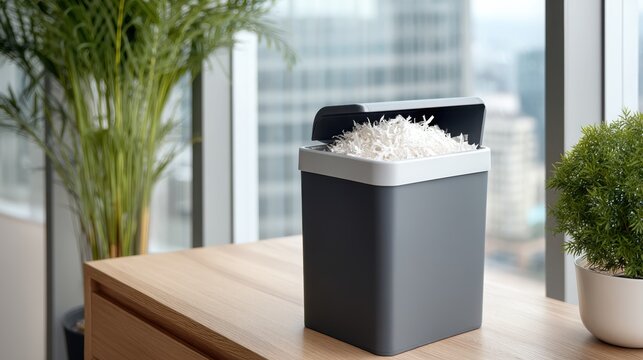 Business Recycling Program Modern office space featuring a sleek shredder beside greenery and large windows with city views.