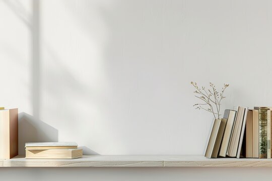 Minimalist shelf with books and plant in sunlight