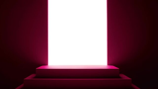 Futuristic dark room with glowing portal and steps, symbolizing progress, achievement, new opportunities, or a minimalist stage for presentations.