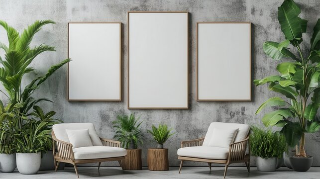 An interior design mockup with blank frames on wooden floor against a white wall, embodying a minimalist aesthetic with clean lines. Generative AI