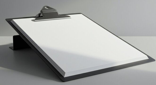 Black clipboard with stacked white pages, angled view, soft lighting, minimalist background, clean composition.