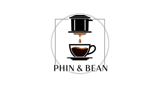 A minimalist black and brown logo for 'Phin & Bean' showing a Vietnamese phin filter dripping coffee into a cup and saucer.