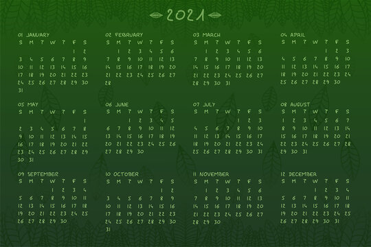 2021 year wall annual calendar template in minimalist botanical eco style. Calendar design concept with hand drawn font type and green leavesstyle. Week Starts on Sunday
