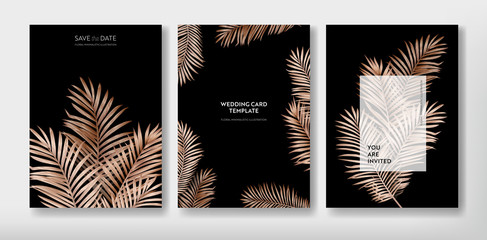 Tropical trendy greeting or invitation card template design, set of poster, flyer, brochure, cover, party advertisement, golden palm leaves in vector