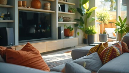 A clutterfree living room with a contemporary grey sofa a few colorful accent pillows and a minimalist entertainment console highlighting the simplicity and functionality