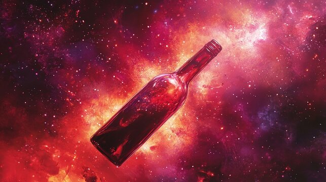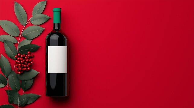 Red Wine Bottle with Green Leaves and Berries on Red Background