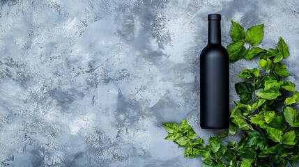 Elegant Still Life of a Black Wine Bottle with Blank Label, Driftwood, and Autumn Leaf on Warm Brown Background
