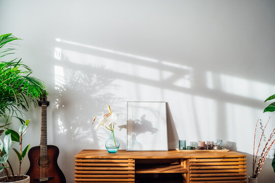 Modern minimalist Scandinavian style interior with white poster mockup, candles and white lily flowers in vase on a wooden console under sunlight and home plants shadows on gray wall. Selective focus.