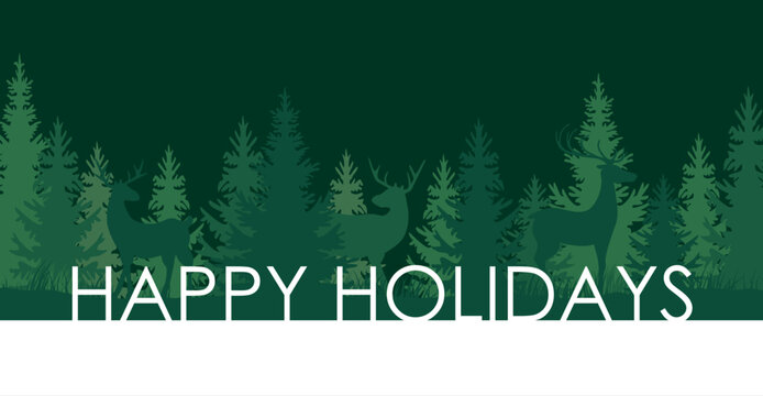 Happy Holidays Lettering in Snow Landscape with deers in forest, clean and minimalist christmas card with copy space, dark green vector illustration for advertising or web banner