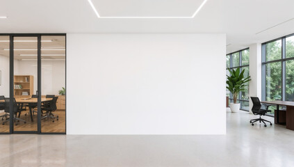 Business abstract background of a clean, minimalist modern office interior featuring a large uninterrupted white wall, centered and ready for company logo, branding, or corporate signage