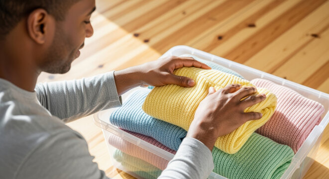 Man organizing colorful folded sweaters into a clear plastic storage container indoors on a wooden floor during spring cleaning