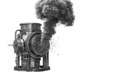 black and white minimalist sketch, a holographic nuclear reactor posed of various particles, subject positioned on the left side with open space on the right for text or graphics