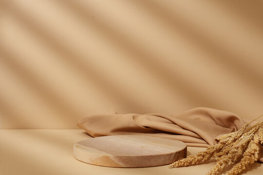 Circle wooden product placement podium with dried plant, shadow on brown background