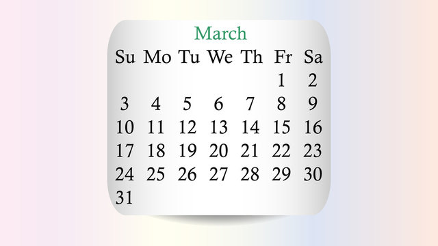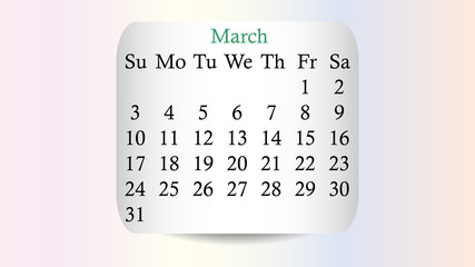 March 2019. Calendar 2019 vector design. Date on the curved stickers on the pastel background