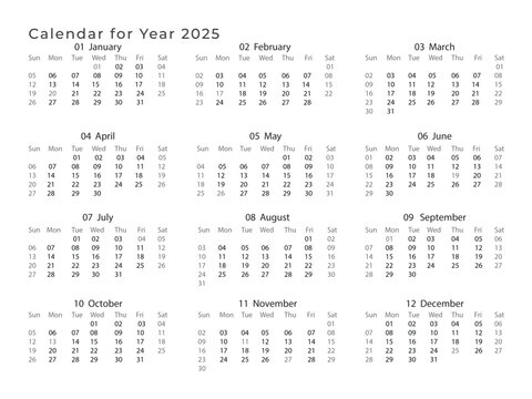 2025 Landscape Black and White Calendar. 2025 Horizontal Black and White Calendar Template.