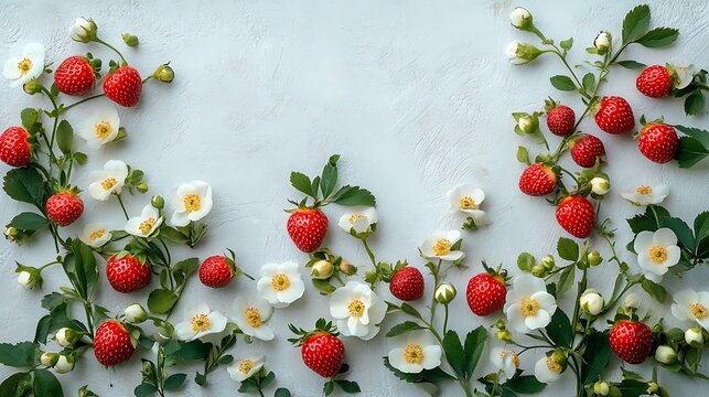 A minimalistic flat lay of strawberries and vintage flowers on a white background, clean editorial look, soft pastel accents, symmetrical layout. Created Using: flat vector design, minimalist layout,