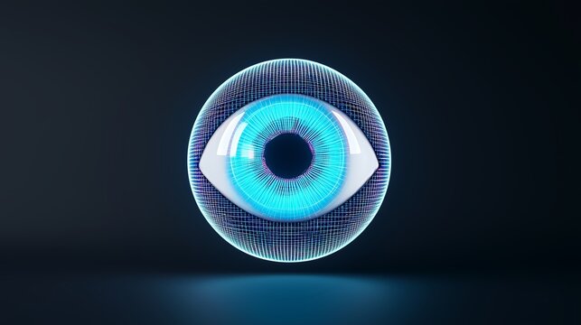 A minimalist digital eye icon glowing softly on a dark background, representing digital vision and eye care.