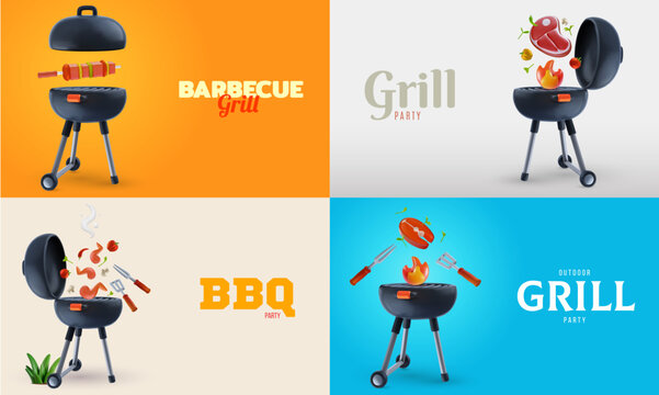 bbq banner template in minimalistic 3d style. Set corporate background for outdoor events. Vector illustration.
