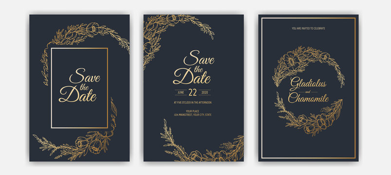 Botanical Wedding Invitation card Template Design, Pine Tree with Golden Foil, Christmas Greetings, Collection of Save the date, RSVP in vector