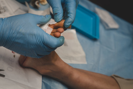 A surgeon or podiatrist performing a minor surgical procedure on the foot of a patient, cleaning, operating and applying a surgical dressing after.
