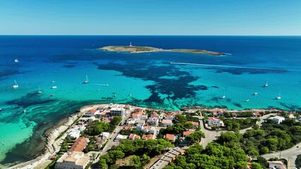 Aerial drone view of Menorca beach at cala de Algariens, Spain